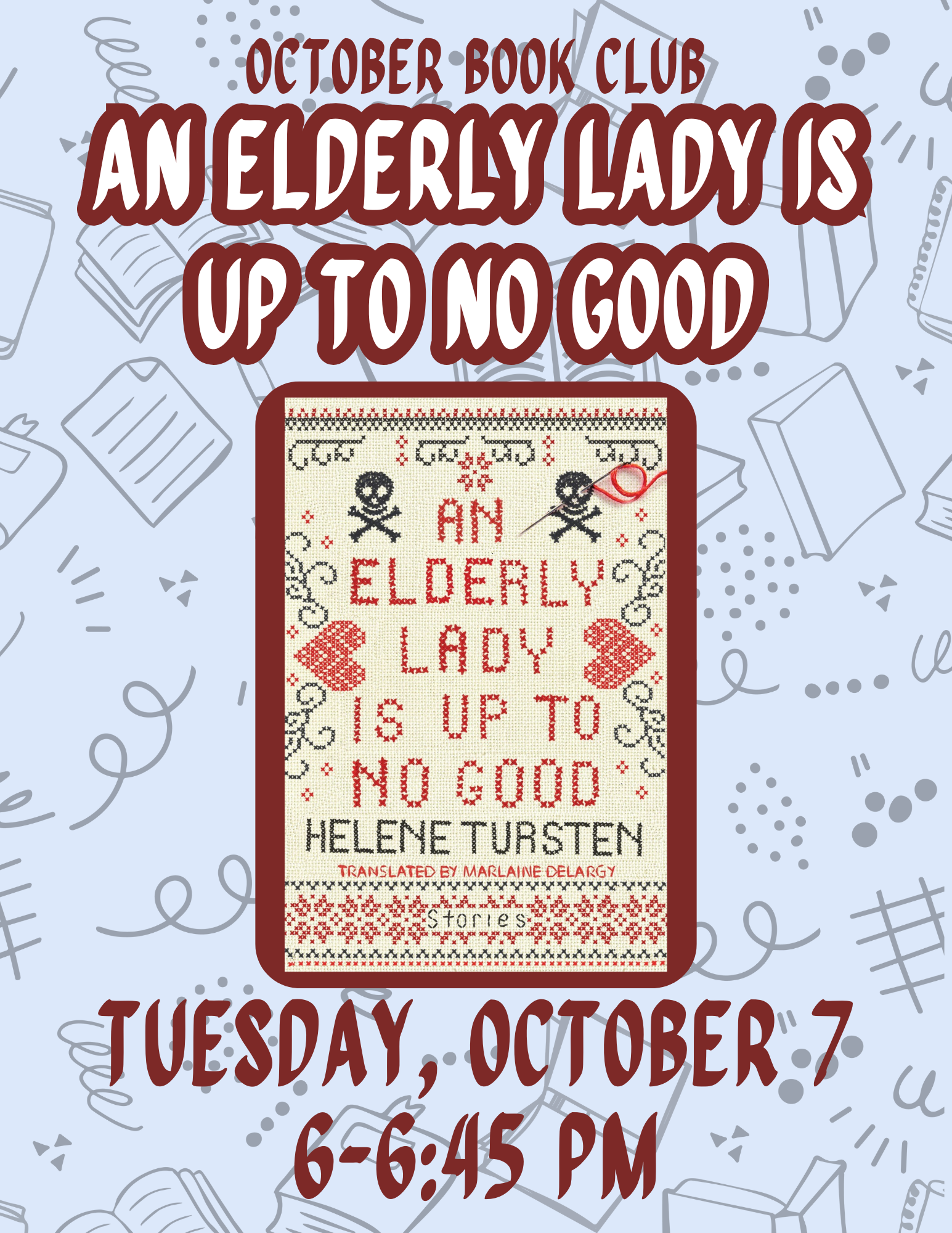 Book Club Meeting where a selected book will be discussed. This month’s book is “An Elderly Lady Is Up to No Good” by Helene Turnsten. Members can also pick up next month’s book, “The Personal Librarian” by Marie Benedict. Contact the library for details regarding joining the book club.