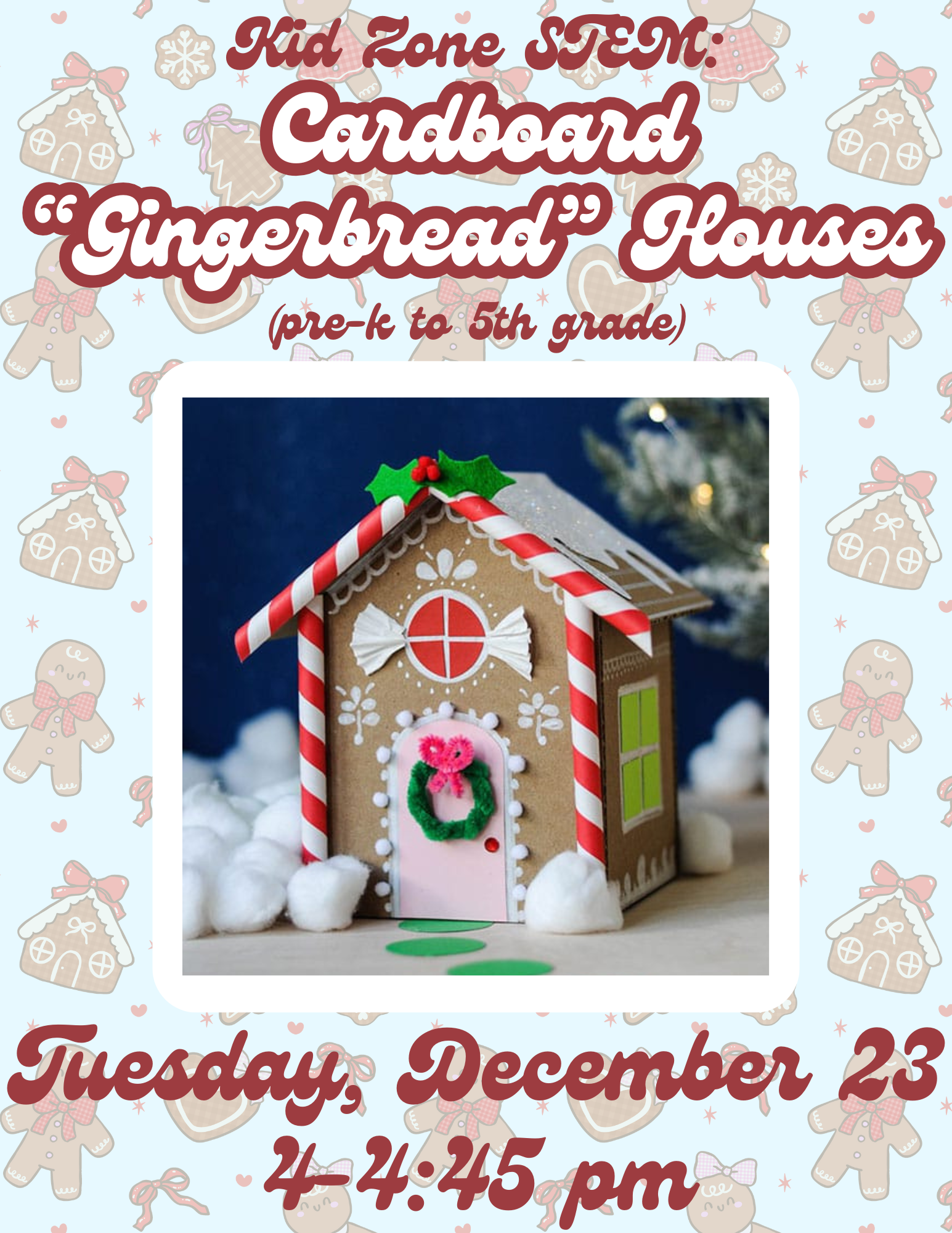 This month’s kids’ STEM program will be cardboard gingerbread houses! This program is best for children in grades 1-5. Supplies and fun are provided!