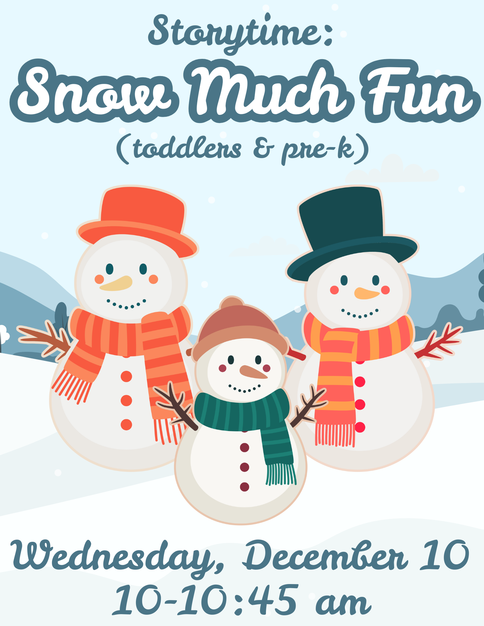 Early Literacy Storytime program for toddlers and preschoolers. This session’s theme is snowmen and will include fun stories, activities, and a craft!