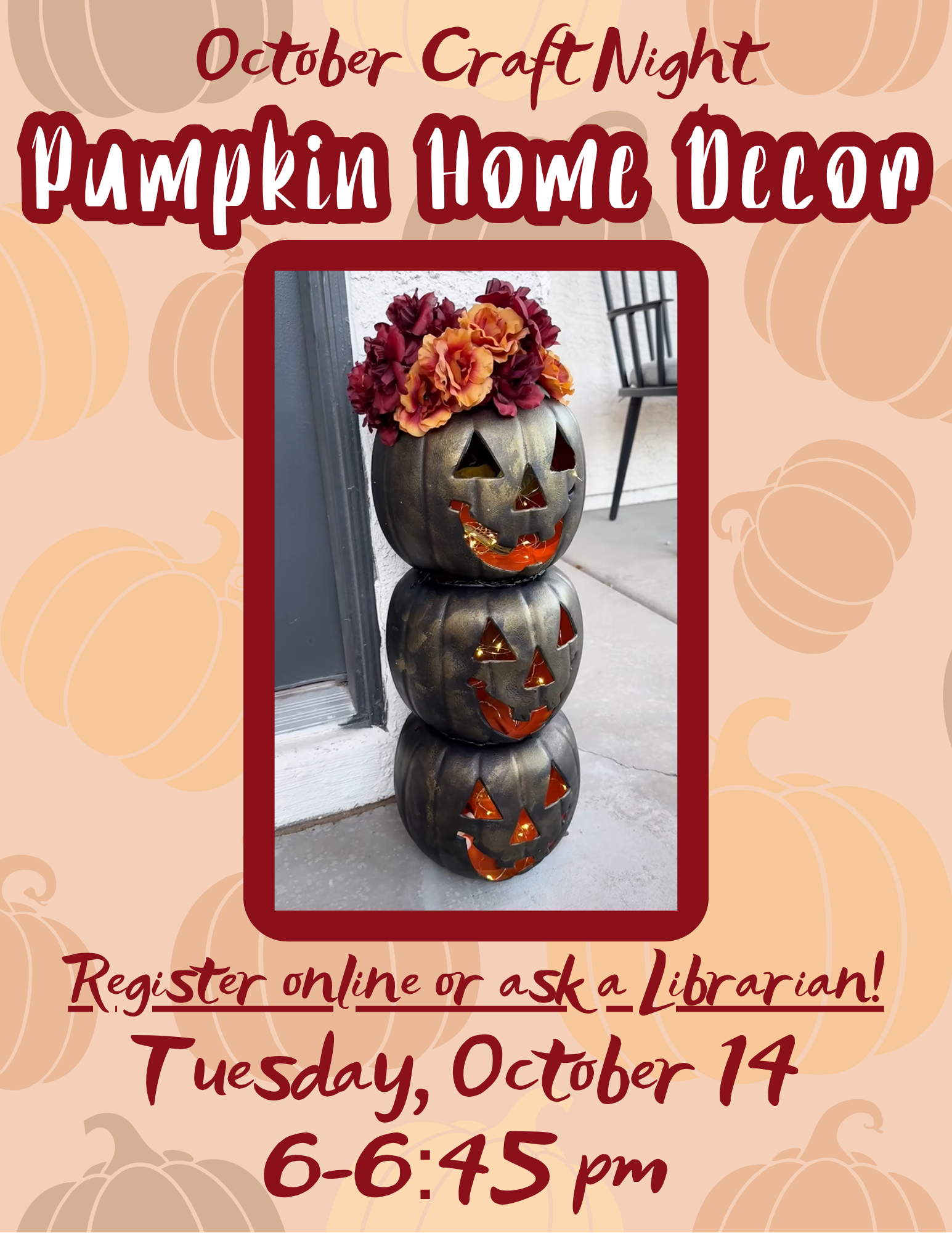 This month's craft will be pumpkin home decor! It will be a relaxing evening that offers allows room for creativity in style. All supplies will be provided. Click here to register to attend.
