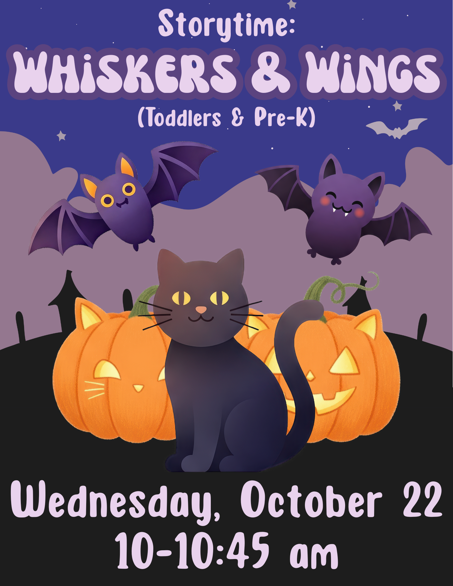 Early Literacy Storytime program for toddlers and preschoolers. This session's theme is black cats and bats, and will include fun stories, activities, and a craft!