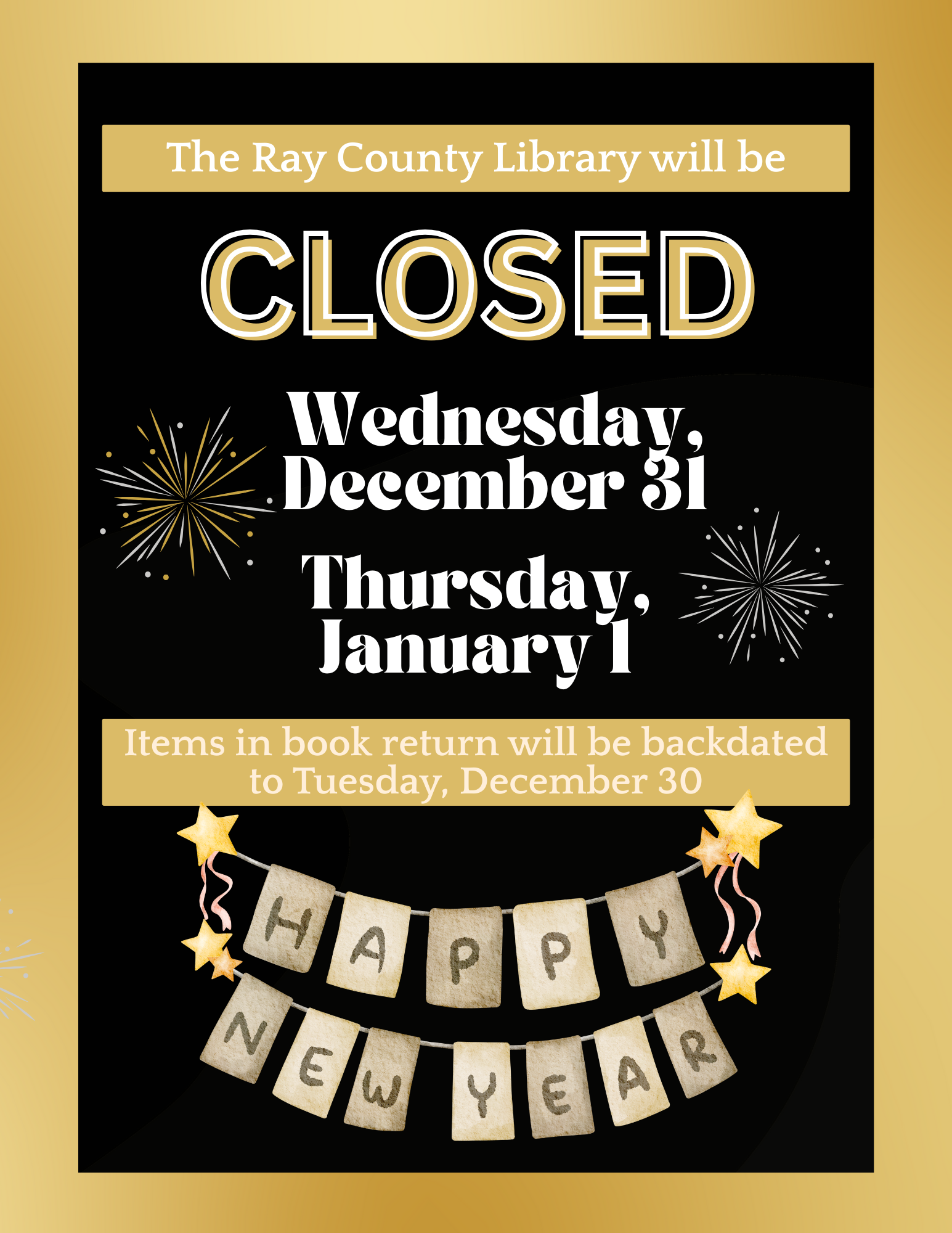 The Ray County Library will be closed Wednesday, December 31, 2025 and Thursday, January 1, 2026 for New Year's.