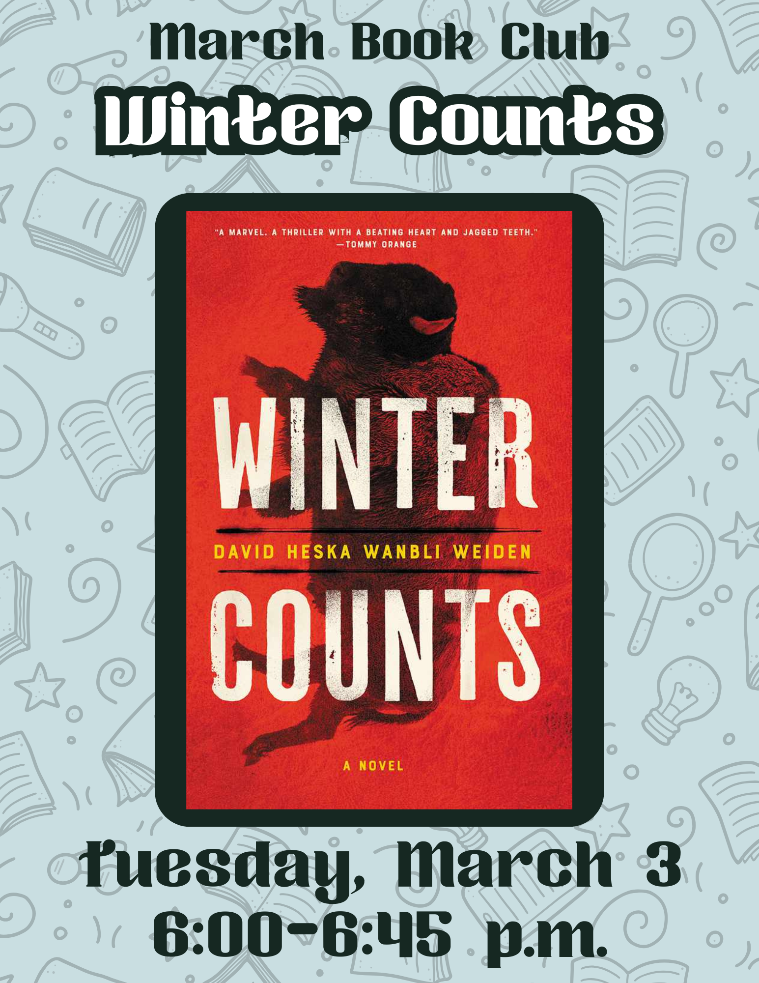 Book Club Meeting where a selected book will be discussed. This month's book is "Winter Counts" by David Heska Wanbli Weiden. Members can also pick up next month's book, "Me […]