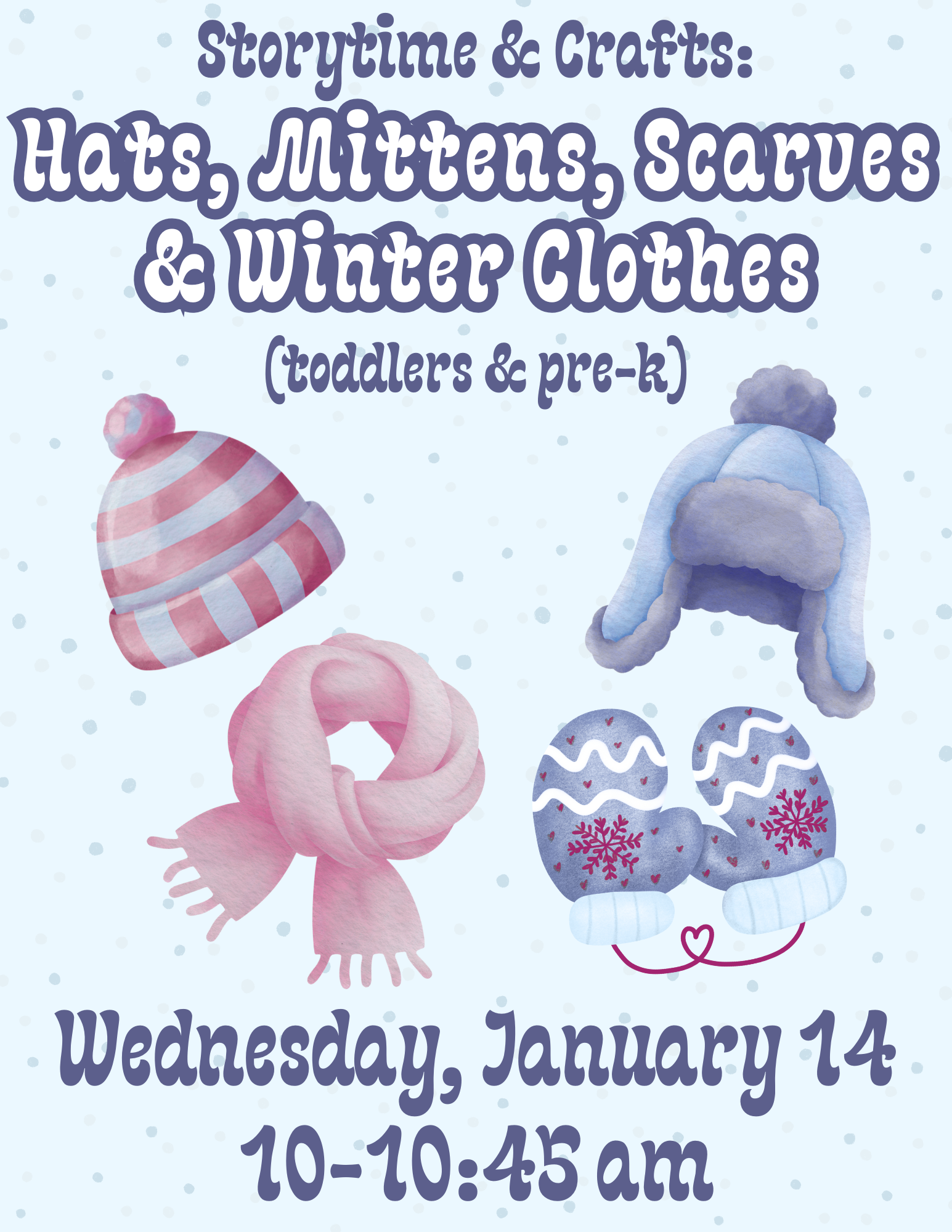 Early Literacy Storytime program for toddlers and preschoolers. This session's theme is winter clothes and will include fun stories, activities, and a craft!
