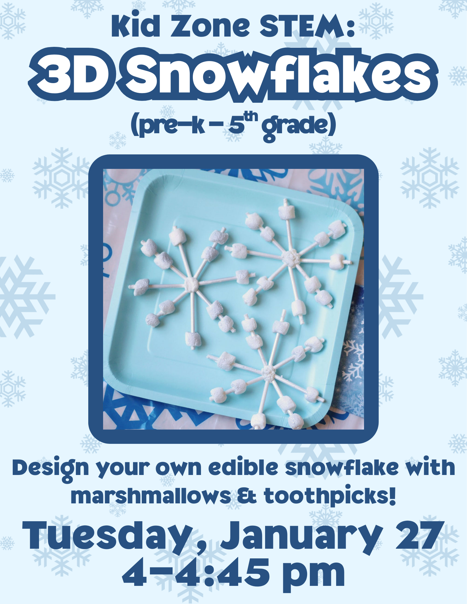 This month's kids' STEM program will be 3D snowflakes! This program is best for children in grades 1-5. Supplies and fun are provided!